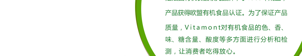 • Vitamont被法國人譽為“飲品界的香奈兒!”因為Vitamont是擁有32年歷史的有機果汁品牌,獲得歐盟有機食品認證,是公認的高品質飲品。 Vitamont的產品包括果汁、蔬菜汁、蔬果汁,通過特殊的壓榨工藝,最大限度地保留了蔬果的香甜和營養。清爽又豐富的口感帶來無限的驚喜,深受大家喜愛。